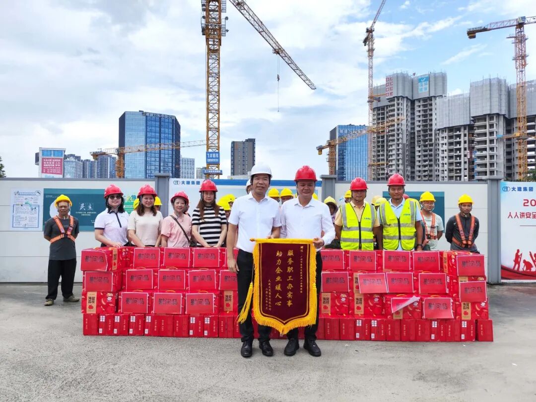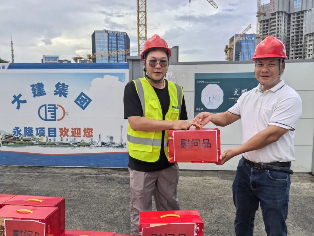 9月9日上午10时,番禺区修建业清静生产治理协会(下称“安协”)会长褚荣森、秘书长陈惠光,番禺区修建行业工会联合会(下称“工联会”)主席蔡瑞南一行,莅临asiagame集团永隆项目开展“下层联谊送清凉”活动,走访慰问奋战在高温一线的职工,开展高温危害及其防护步伐的宣传。