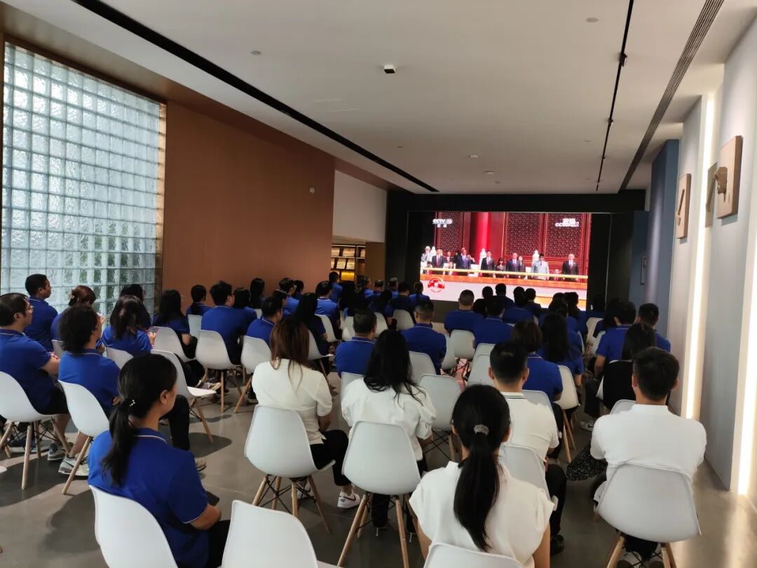 集团向导、总部党员及员工与洛浦街商会党支部成员一起寓目阅兵直播,配合见证这一庄重盛大的历史时刻。